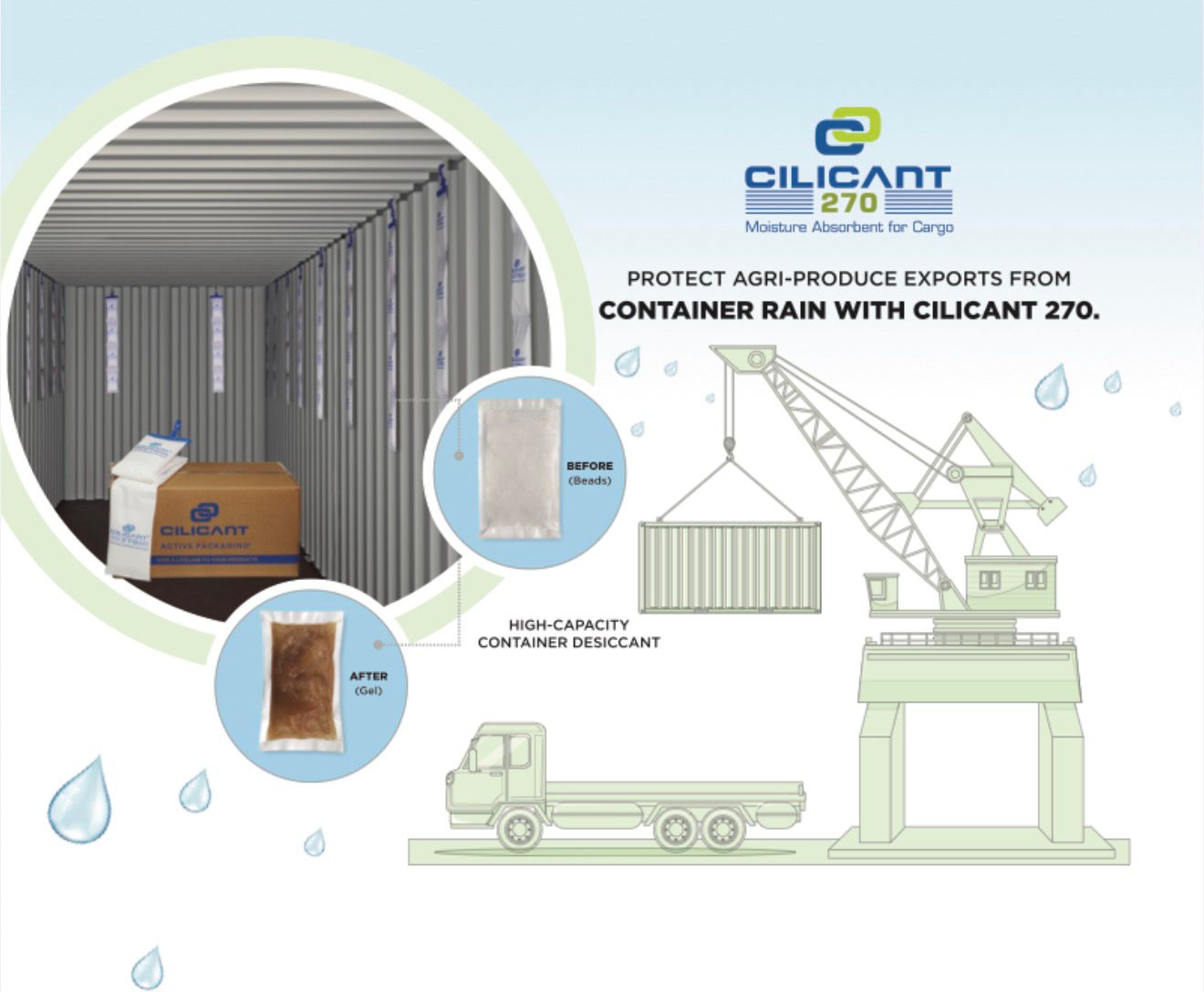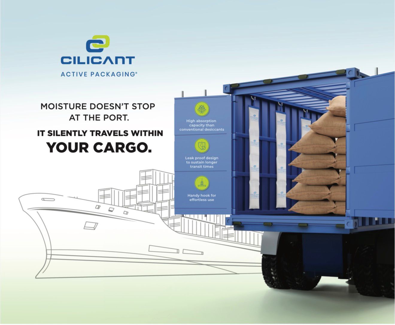 CILICANT container desiccant safeguards your precious cargo from the degrading effects of moisture, such as container rain which forms in cargo containers during long transits.